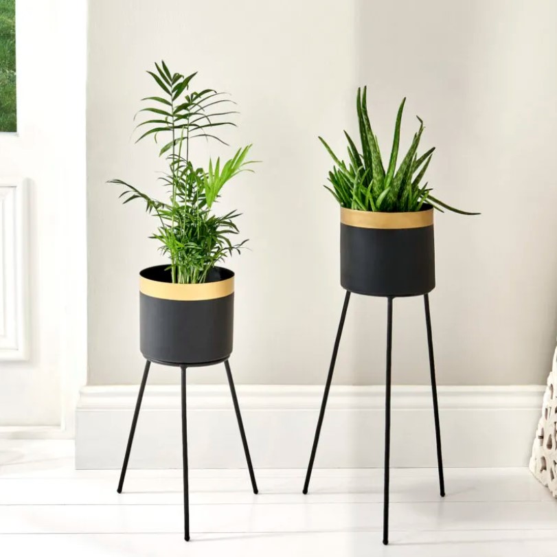Our accent black metal plant stand is trendy and eye-catching. The gold rim adds that extra element of class and resting on slim metal legs, the stands fit nicely into any space, big or small.