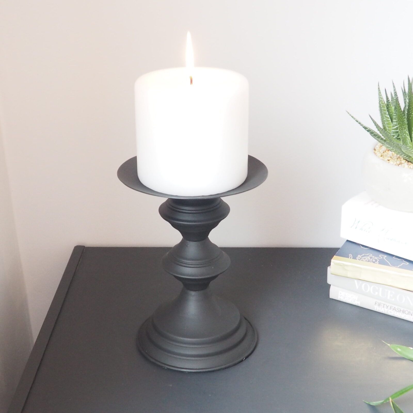 The perfect finishing touch to your festive dining table or fireplace, this chunky black pillar candle holder will add soft mood lighting to any occasion. Use them as part of a table setting or centrepiece to wow your guests.
