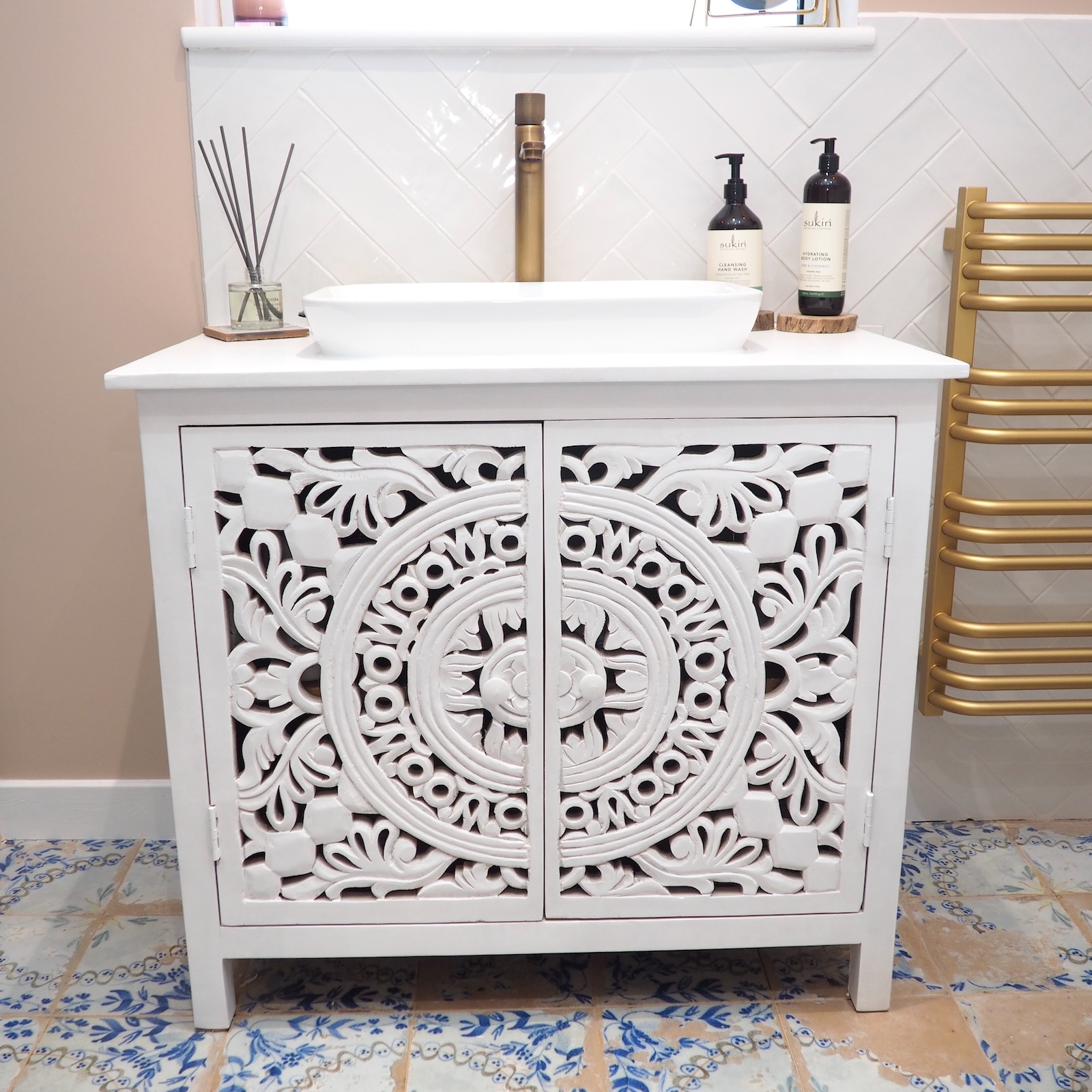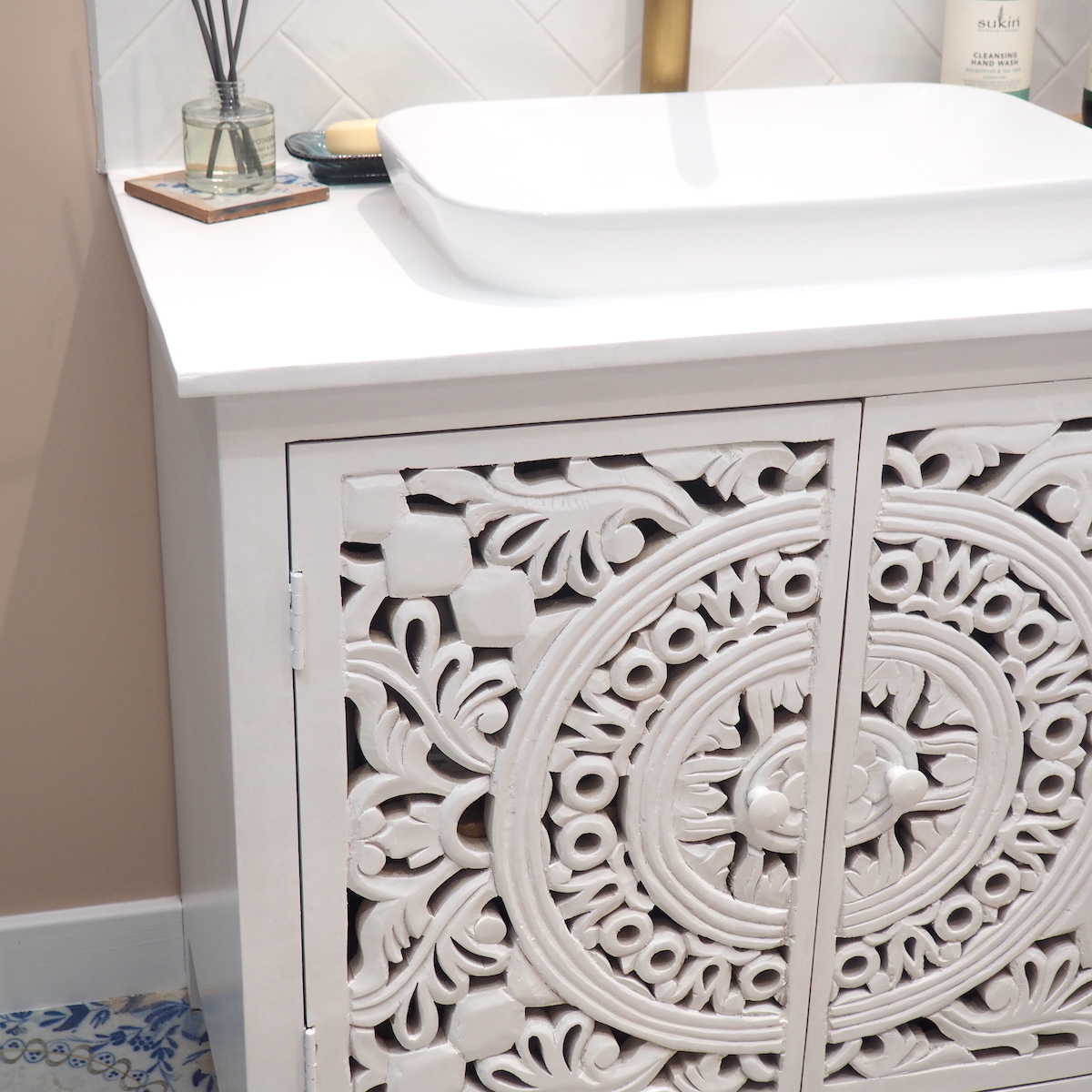 Ready to take centre stage in your bathroom is this stunning white bathroom vanity cabinet. Beautifully hand carved and painted in a warm, soft white this exquisite vanity is crafted with meticulous attention to detail with such intricate detail, It really does catch the eye as soon as you enter the room!