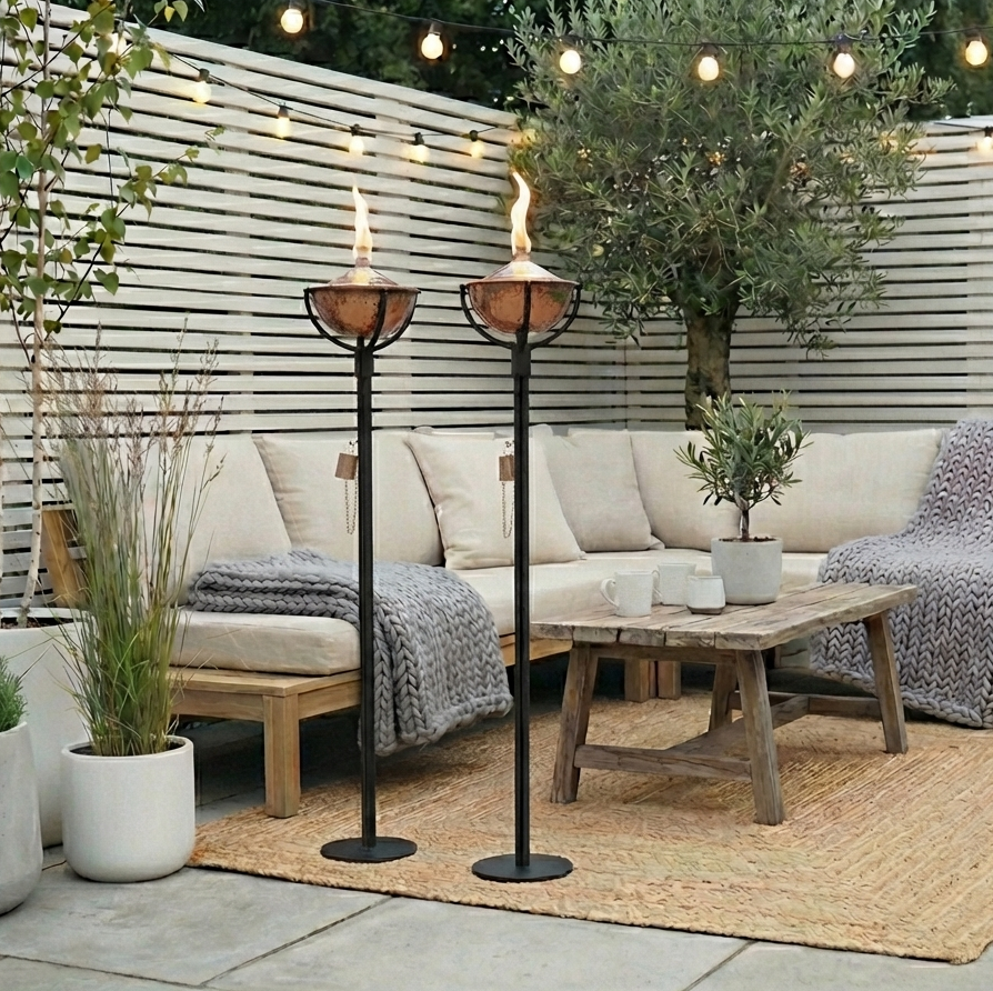 See a short video HERE’ taken by our customer Melanie @oakforeverhome, featuring the Roma oil torches lit on her two beautiful patio areas. It is a lovely setting which shows how the flames from these garden torches really do add the finishing touch to a cosy outdoor seating area.