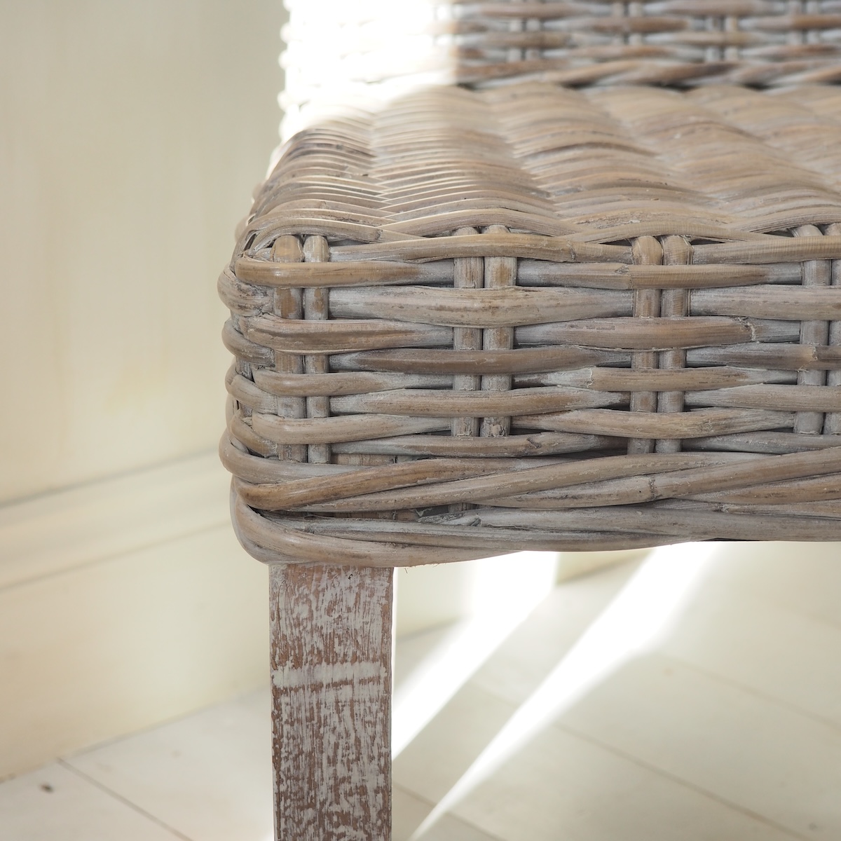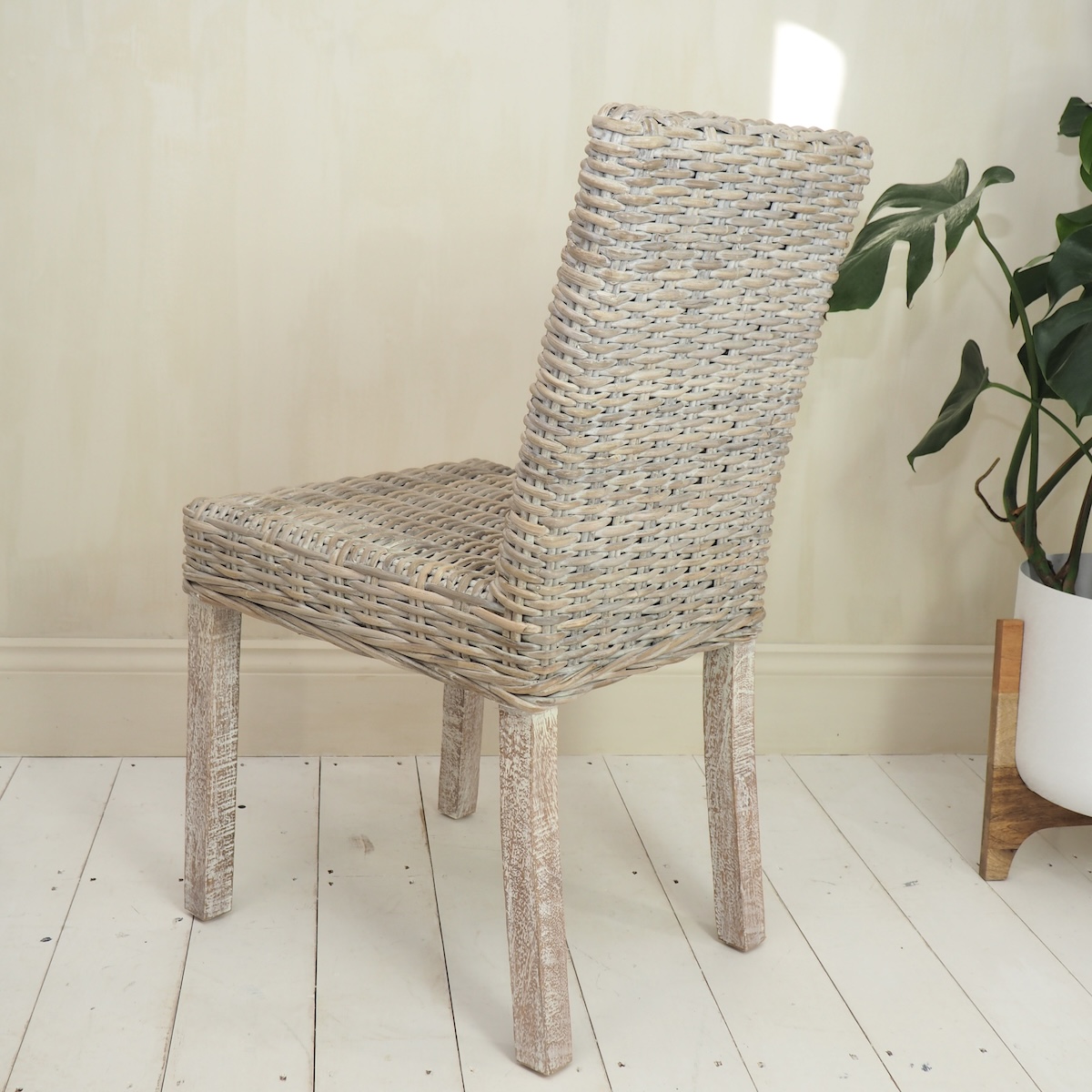 With a solid mango wood frame and hand woven kubu wicker, this dining chair has a very strong and sturdy frame. Each of these rattan dining chairs are white washed by hand so the natural colours in the wicker and wood will vary slightly.